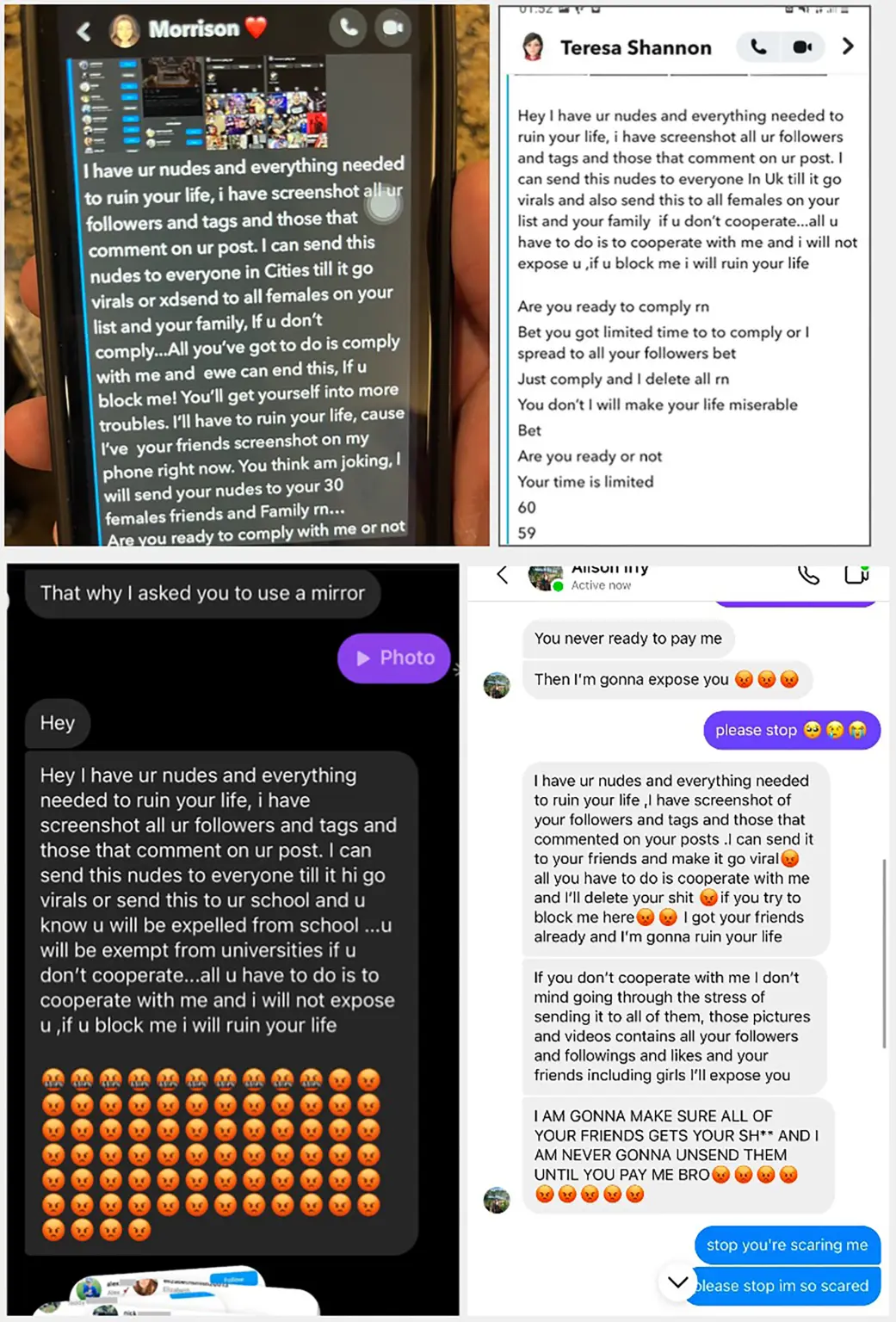 他们时时是被哄骗着发送了裸照或是个东谈主诡秘信息。诳骗者会拿这些信息恐吓他们,称不听从敕令就会散布出去导致其“社死”,最终把他们逼上死路。